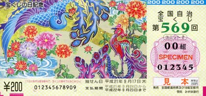「宝くじの日記念 第569回全国自治宝くじ」の発売予定額は100億円。1枚の価格は200円で、5,000万枚の発売です。発売期間は2009年9月2日 水曜日から9月15日 火曜日までとなっています。